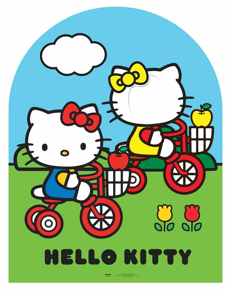 The stand-in cardboard cutout features a meadow setting with Hello Kitty and Mimmy riding their bikes and you can find pictures of both cutouts below.